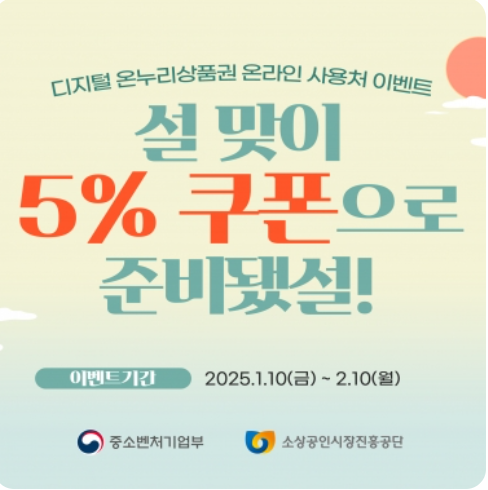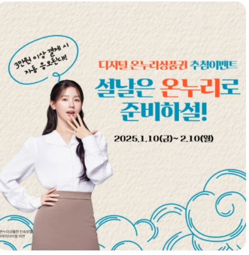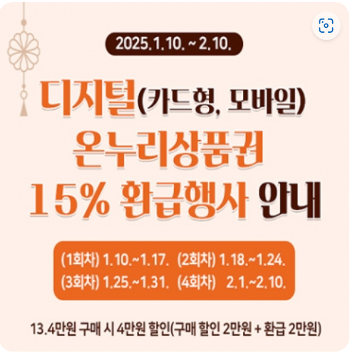 2025 설을 맞이하여 정부 지원으로 월 최대 50만 원까지 5~15% 할인된 금액으로 구매 가능합니다. 예산 소진 시 혜택이 종료되므로 서둘러 구매하세요.