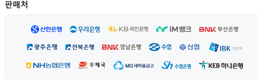 구매처: 지정된 은행 (우리은행, 신한은행, 농협 등). 은행 창구에서 신분증을 제시하고 원하는 금액을 구매 신청하세요. 개인은 5~10% 할인 혜택을 받을 수 있습니다.